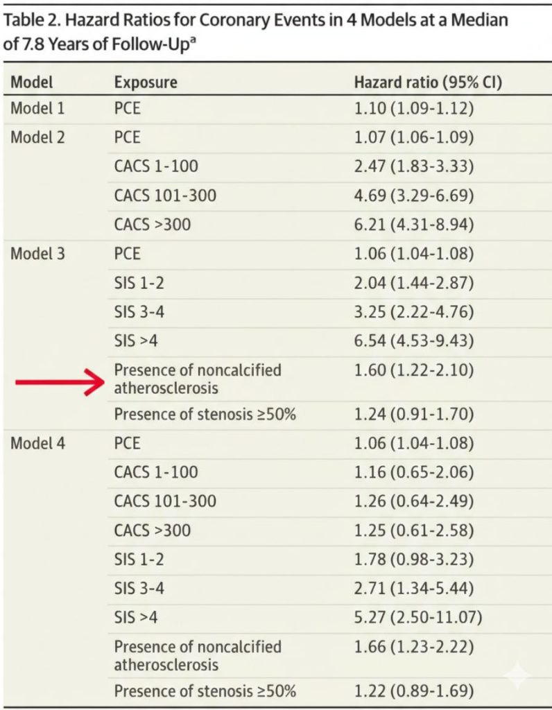 Um grande estudo populacional recente (JAMA), com quase 25 mil indivíduos de 50 a 64 anos sem doença cardiovascular conhecida e seguimento de aproximadamente 8 anos, mostrou que a presença de placa não calcificada na CCTA se associou a maior risco de primeiro evento coronário e que a inclusão dessas informações anatômicas melhorou a predição de risco e a reclassificação, principalmente entre os pacientes inicialmente rotulados como baixo risco.